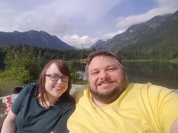 Image Description (photo on right): Laura (a redheaded woman wearing a green shirt and glasses) and Clark (a man with brown hair and beard wearing a yellow shirt) lean together and smile on a sunny day at Gold Creek Pond; in the background, a lake, evergreen trees, and mountains under a blue sky with fluffy white clouds.